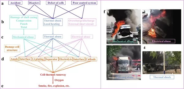 自從電動(dòng)汽車在(zài)世界市場(chǎng)上銷售劇增以來,全球各地頻繁發生火災事故。這些事故導致了車輛損毀(huǐ)和乘客傷(shāng)亡,進而引發電(diàn)動汽車用戶積極性衰退。鑒於此,泰國國王科技大學Yossapong Laoonual等人對鋰離子電池的熱危害(hài)和消除熱失控危險的有效安全策略進行了綜述。首先(xiān),他們解釋了(le)熱失控(TR)及其相關鏈式反應的機理,如SEI層的擊穿、負極/電解(jiě)質之間的反應(yīng)、電解質的擊(jī)穿、電(diàn)極之間的反應等,這些反應反過來會產生巨大的熱能和各種易(yì)燃氣體。在組件級,主要問題是(shì)TR傳播到模塊內部和模塊之間的(de)相鄰(lín)電池。TR傳播事件將(jiāng)熱效應傳遞給相鄰的電池(chí),最(zuì)終導致電池(chí)組災難性損壞。因此,為了降低(dī)鋰離子電池的熱危害,他們總結提出了適(shì)當的措施,例如使用熱保護分離器、安全裝置、阻燃劑、被動冷卻裝置和滅火劑。