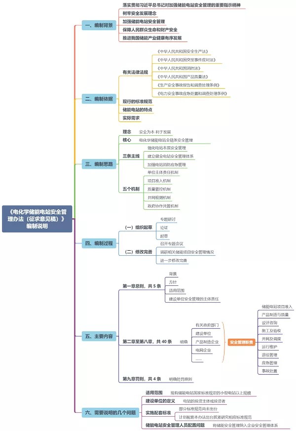 《電化學儲(chǔ)能電站安全管理暫行辦法(征求意見稿(gǎo))編製說明》內容導圖(圖表為(wéi)網絡作者整理製作)